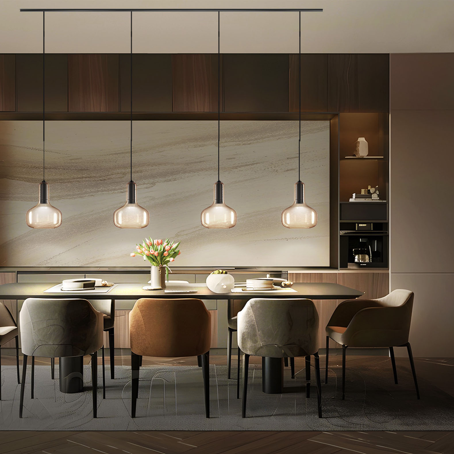 For longer tables, three individual pendants, a canopy, or a rail system are ideal. Lights should be spaced evenly – around 60–80 cm apart.