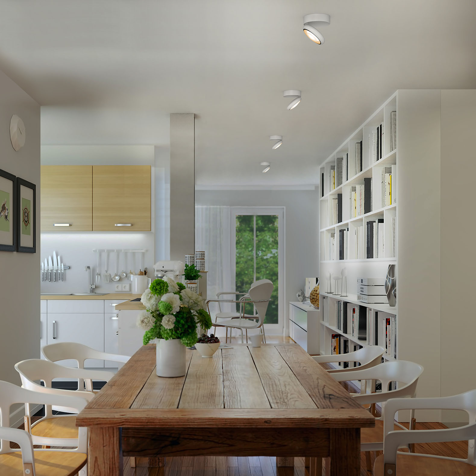 In combination with pendant luminaires, a sophisticated lighting concept is created above the dining table - uniform illumination plus decorative highlights.