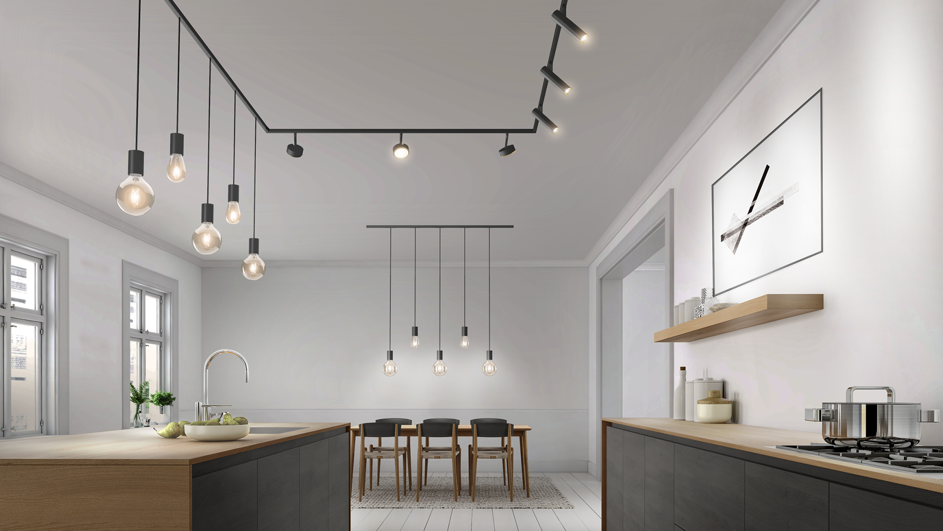 Qu'il s'agisse d'une simple suspension décorative, d'un spot simple ou double ou d'une combinaison avec un système de rail BRUCK,