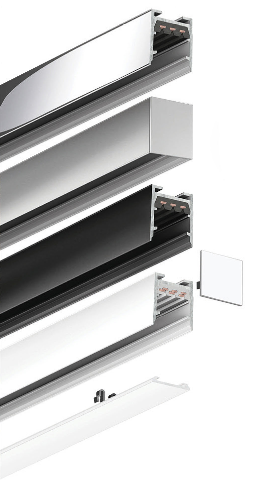 Le système de rails ALL-IN offre une adaptabilité maximale avec des longueurs de 1000 mm à 2600 mm. Les connecteurs linéaires permettent d'allonger le système à volonté ou de raccourcir le rail à n'importe quel endroit.